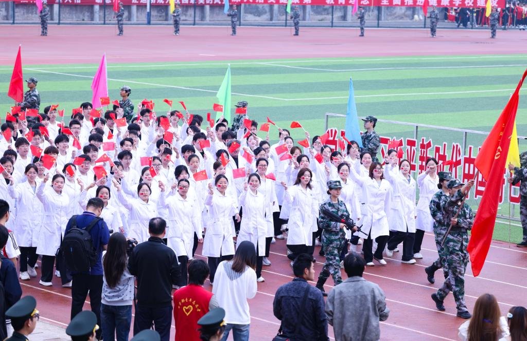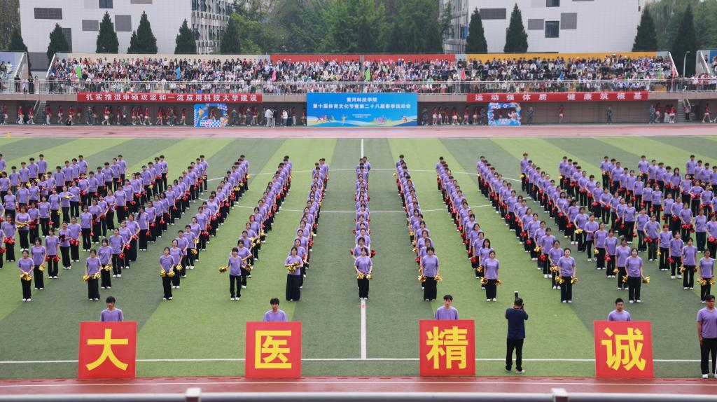 在和煦明媚的春光里,商学部、国际学院、医学部带来的团体操表演依次登场,如春日繁花般绚烂多姿,在绿茵场上舒展绽放,尽显青春昂扬的蓬勃朝气!商学部520名学子表演的《旗耀征程开新局 青春奋进十五五》,以红旗为笔、以赛场为卷,演绎三大篇章。红旗映心礼赞盛世,党旗领航笃行育人,策马逐梦青春奋进。方阵变幻如旭日东升,尽显同心向党、勇攀高峰的青春风采,献礼建党105周年与学校高质量发展。随后,国际学院团体操《加油!AMIGO》震撼登场。红衫少女手持金紫花球,舞步轻快灵动、节奏热烈奔放,队形错落有致、创意十足,洋溢着青春气息,用热情与活力点燃全场,尽显开放自信、朝气蓬勃的学子风貌。医学部团体操《青春共振》惊艳亮相。队员身着紫色T恤、黑色长裤,手持金红花球,以整齐划一的动作、蓬勃昂扬的姿态,在绿茵场上奏响青春乐章。动作整齐刚劲、气势昂扬坚定,以医者初心凝聚力量,将团结与热血融入每一个节拍,尽显黄科学子向阳而生、奋勇争先的精神风貌,为春运会注入无限活力与激情!